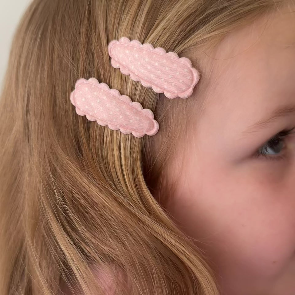 This set includes 2 snap clips, each covered with 100% cotton fabric featuring a scalloped edge design. The clips measure approximately 4.6cm wide by 1.8cm tall, and the backs are finished with felt lining to help keep them securely in place.