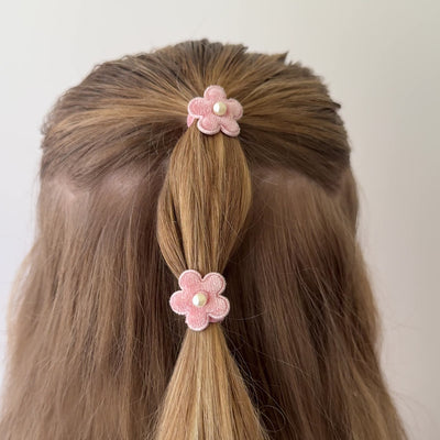 Sweet and delicate — our Pink Velvet hair ties feature soft velvet flowers finished with tiny pearl centres. A charming pair that adds a gentle, girly touch to ponytails, pigtails, and everyday hairstyles. The flowers measure approximately 2.2cm, and are attached to soft, stretchy elastics with a 3cm diameter for a comfortable fit. The backs of the flowers are covered with felt for extra security and durability.