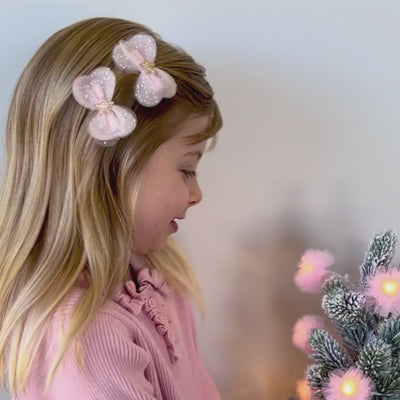 Twinkle brings a soft shimmer to any festive look. This set includes two Twinkle Mini Blossom Bows, crafted from sheer pink tulle with silver glitter accents and finished with a golden star centre for a touch of sparkle. The bows measure approximately 6.5cm wide by 4cm tall and are attached to 4cm alligator clips with teeth. One is designed for the left side and the other for the right side.